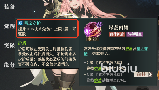 张星彩的普攻可以前排单体造成80%的物伤,同时使自身获得防御25%的护盾,不错的伤害兼自保型普攻。她的绝技“星芒闪耀”则可以给全队队友提供防御79%(87%)的护盾以及1层星之守护buff,该buff能为角色提供10%的法伤减免。