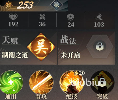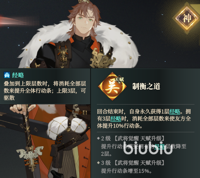 孙权的天赋是制衡之道。回合结束的时候可以永久获取1层经略,在拥有3层的时候将会全部消耗掉来提升我方的行动条10%。2级则是让消耗的经略层数便为2层。3级行动条增加为15%。