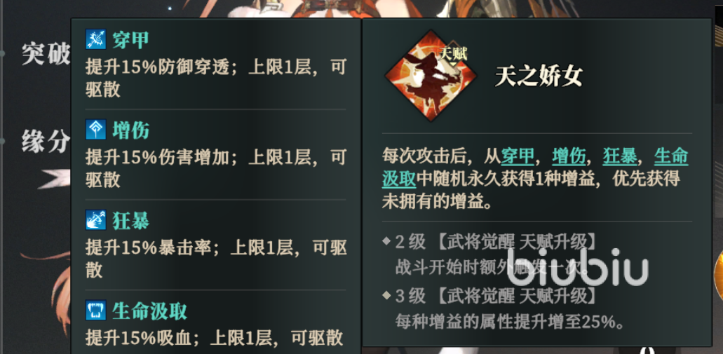 这里就得提到孙尚香的天赋“天之骄女”了,每一次攻击后都可以从穿甲、增伤、狂暴、吸血中永久获得1个增益,优先获取没有拥有的增益,除了吸血都可以提供直观的输出增益,因此孙尚香也是属于越战越强的武将。