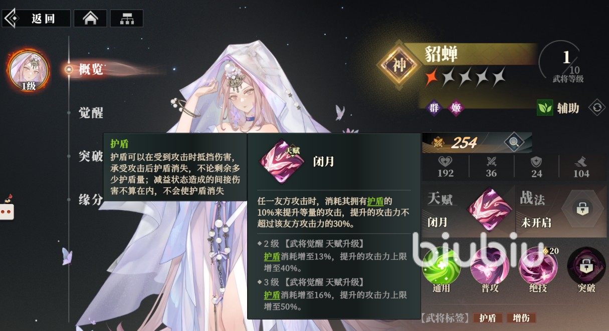 貂蝉的天赋是“闭月”会在任意队友攻击时,消耗其10%的护盾值来提升等量的攻击,整体提升的攻击力不会超过该队友的30%,升到2级会让护盾消耗增加到13%,提升攻击力的上限增加到40%,3级护盾消耗增加到16%,攻击力上限加到50%。