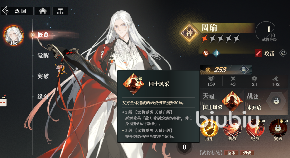 他的天赋“国士风采”是让全体友军形成的灼烧伤害提升30%,升到2级会新增敌方受到灼烧伤害时,自身提升8%进度条的效果,3级会让灼烧伤害增加到50%,他的通用“破甲”会获得10点战意,并使得自身获得1回合破甲效果,破甲能20%无视防御,最多可叠加1层可被驱散。