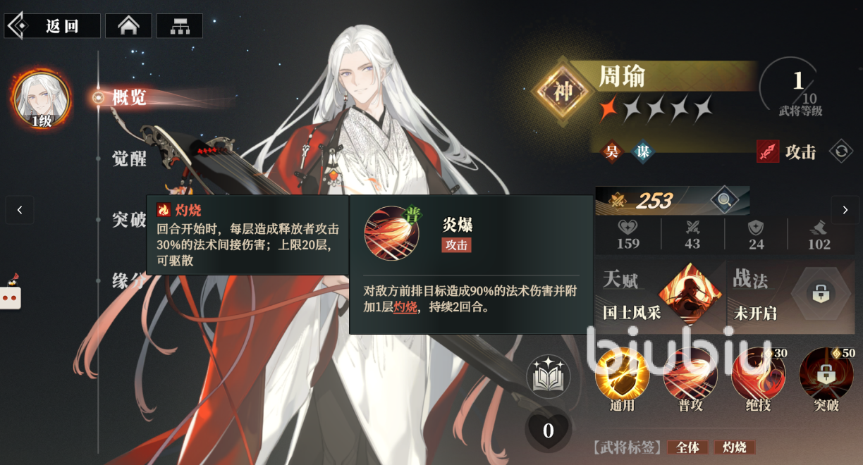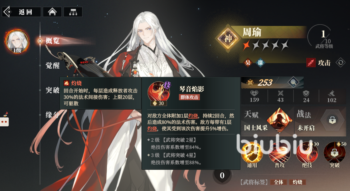 他的突破技“赤壁灾炎爆”会引爆敌方全体,立刻结算目前所有的灼烧层数以及回合数,当武将突破到5星后,还会解锁2级效果在引爆后对敌方全体附加2层会持续2回合的灼烧。