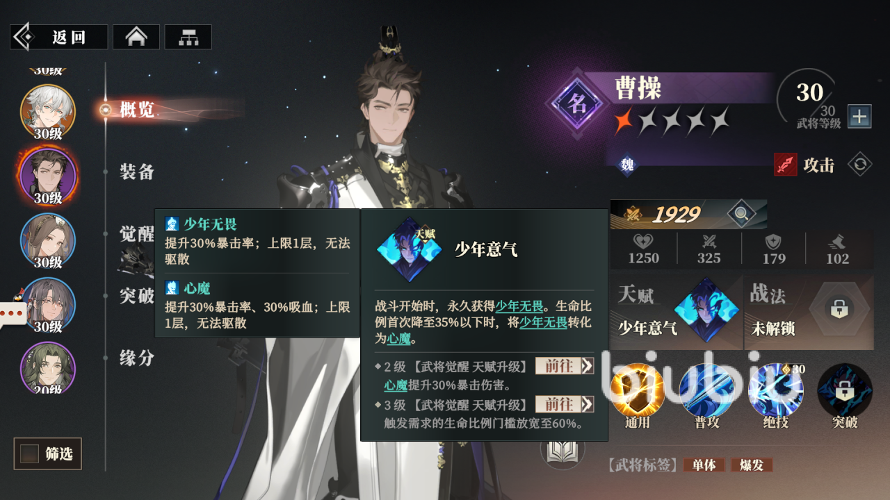 天赋效果“少年意气”,在战斗开始时,他会永久获取“少年无畏”;在他的生命值比例第一次降低到35%以下时,将“少年无畏”转化成心魔;“少年无畏”可提高曹操35%暴击率;“心魔”能提升30%暴击率的同时提高30%吸血,都是1层上限,但是不可被驱散;2级后心魔暴击伤害提升30%;3级时触发的生命值需求直接放宽到60%。