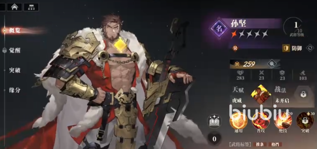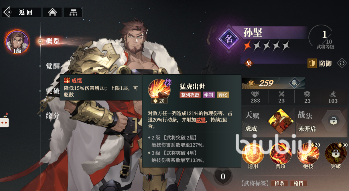 突破4星升到3级会让伤害增加到133%,他的突破技“威震江东”在释放以后会击退敌方20%的行动条,玩家把武将突破到5星解锁到2级后,还会让这个行动条的击退进度增加到30%。