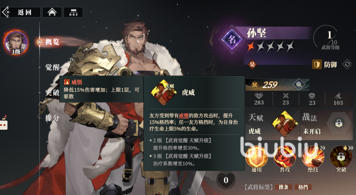 他的天赋“虎威”会在队友收到带有震慑的敌方攻击时,提升自己15%的格挡率,并且任意队友格挡时,还能为自己治疗5%生命上限的血量,升到2级会让这个格挡率增加到30%,3级则是让治疗增加到10%。