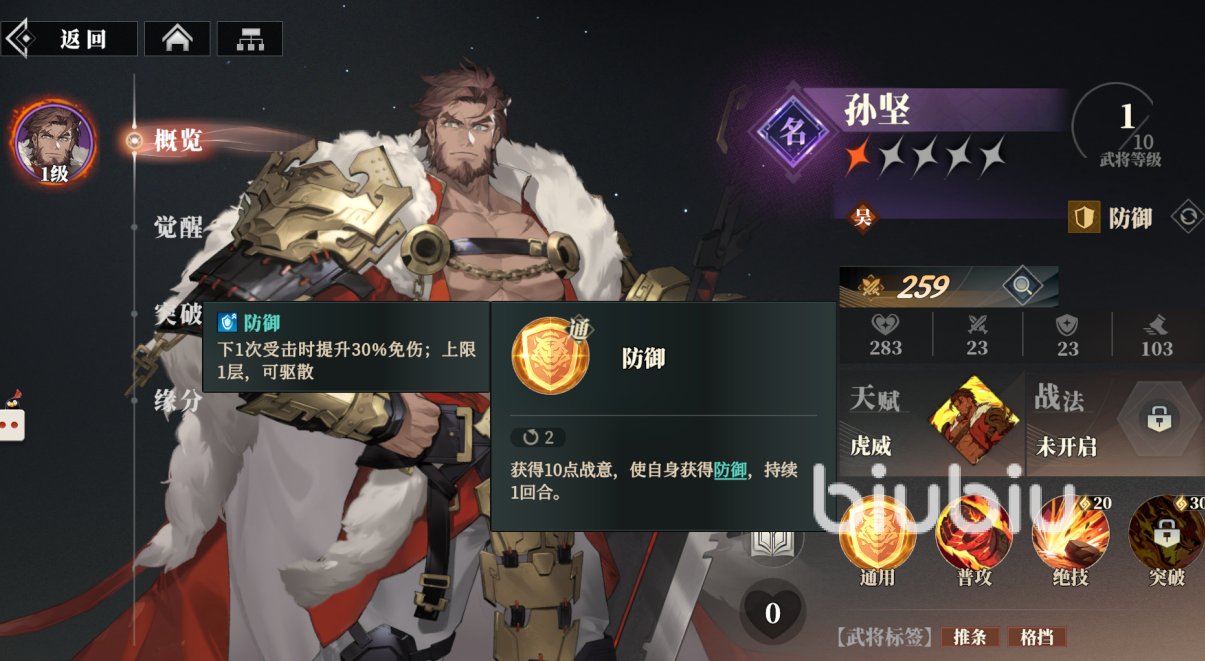 他的通用“防御”会让自身得到10点战意,并使得自身获得持续1回合的防御,防御效果会在下一次遭受攻击时,提升自己30%免伤上限为1层,可以被驱散,他的普攻“虎跃”会对敌方前排敌人形成100%物理输出。