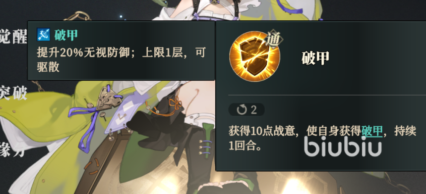 她的普通技能是破甲,这个技能是很多战士类型的角色都拥有的技能。此技能可以增加自身10点战意,同时让自己拥有破甲的效果。可以提升自己20%的无视防御,不可叠加,可以被驱散,持续1回合。