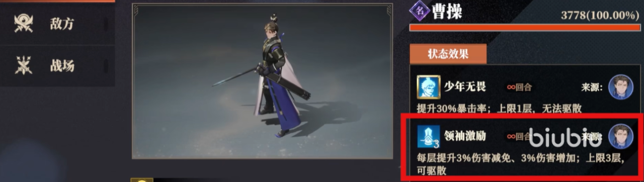 先看看曹操的技能,通用技能有两个,一个可以增强自身的破甲效果,可以随着回合的增强进行叠加,另一个是驱散效果,可以驱散我方的负面效果,属于可以进攻也可以辅助,这很符合领袖的设定,可以在很多的阵容进行就业。