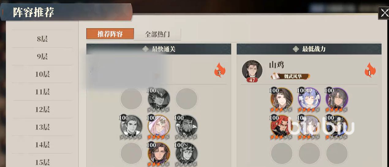 草莽英雄这个关卡是可以使用魏国护盾队伍通过的,而且这个配置要求较低,能保证全员无双通关,这样就能保证后续的层数依旧可以有强力的武将可以使用,首先队伍内需要有驱散增益效果的英雄,因为这个boss关卡增益过多的时候,是可能直接秒掉一个人的,这样后续基本上会被对面的boss活活消耗光。