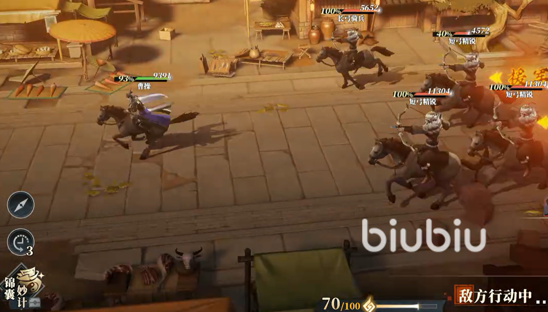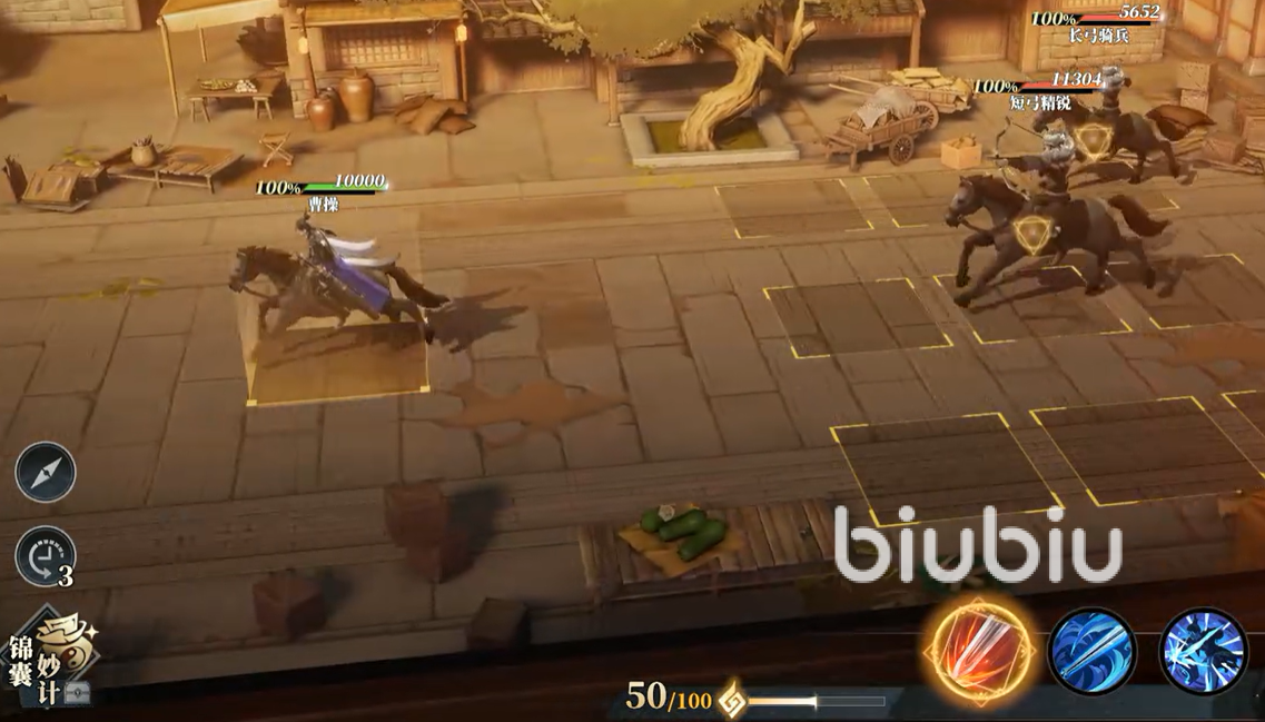 这时候上方又会出现几个攻坚追兵,其中一个支援兵的速度较快,但是输出的手段为近战,利用曹操的石头技能将对面的支援兵击杀,接着就剩下三个弓兵,利用小技能依次完成斩杀就能顺利逃出关卡,而结束以后血量大致会保留在80%以上,从而顺利通关。