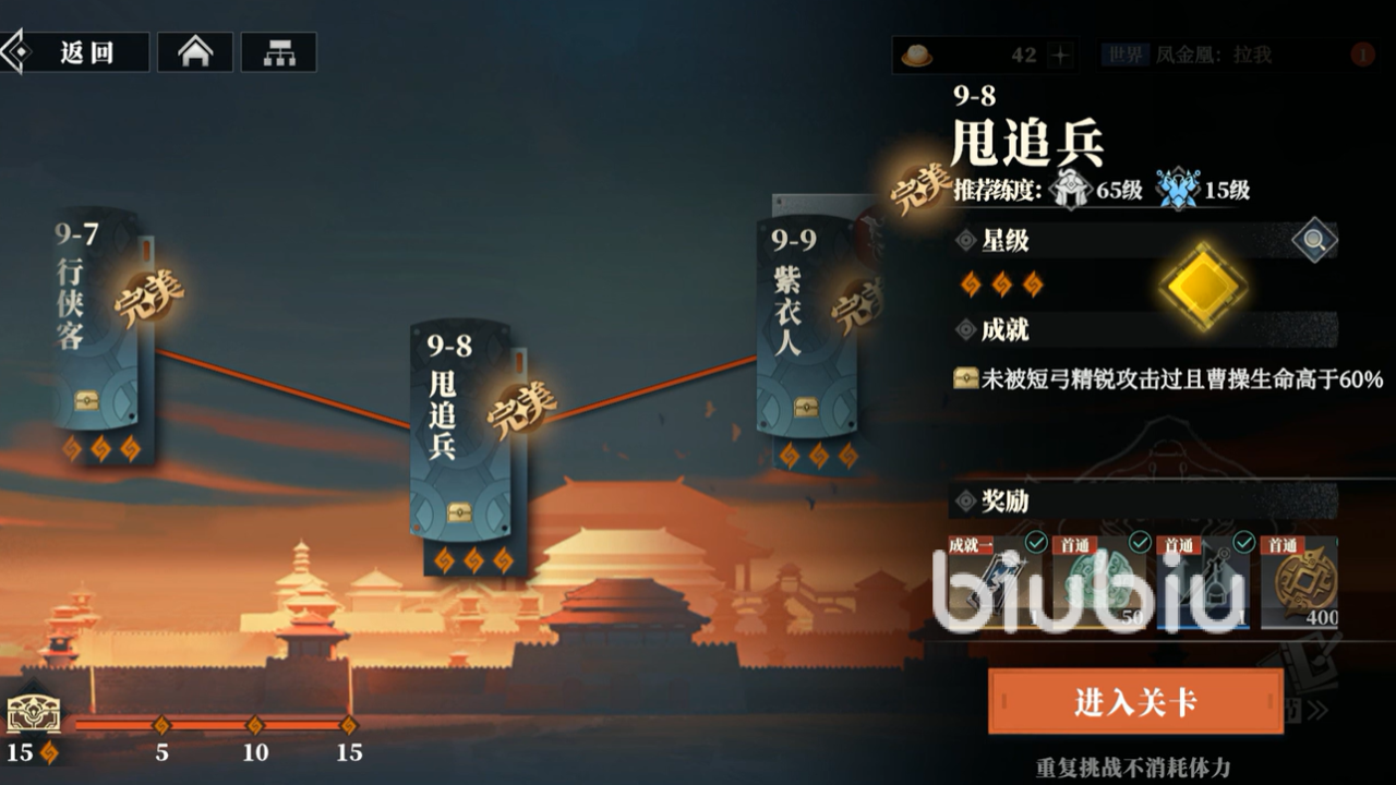 9-8关卡是一个机制关卡,这个关卡想要完成满星通关的话,需要有三个条件,第一个条件是在对面追击7个回合内存活,还有两个条件就是我方剩余的生命需要大于百分之30以及40,而本关是不考验任何练度,只要能保证关卡内的曹操能顺利存活就可以通关。