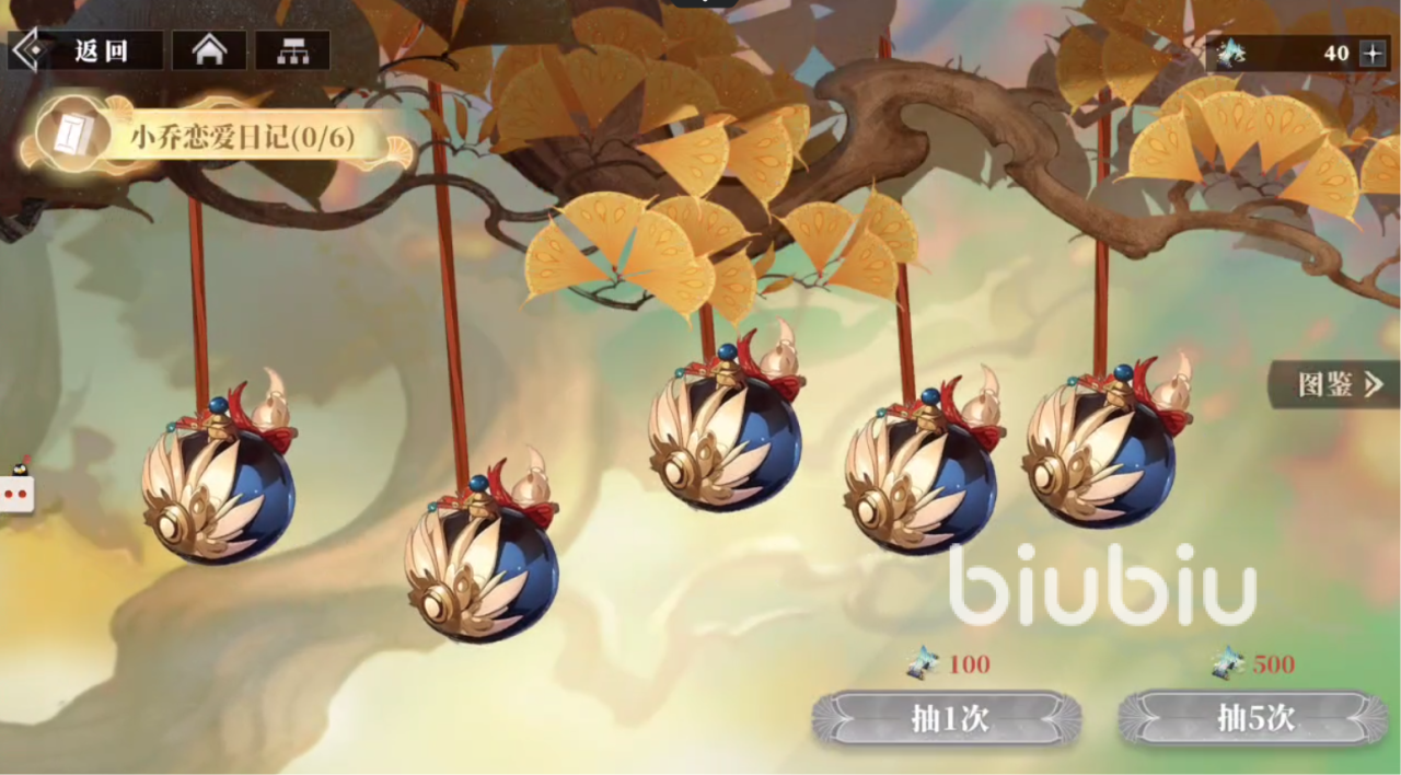 例如小乔的恋爱日记,这里想要收集小乔的物品。那就需要进行抽卡,抽卡道具叫做三山绘典,只需要100个就能抽一次。抽5次的话就要500个,大家可以在这个里抽到六种东西,分别是小乔的私人所有物,一旦全部集齐的话,就可以让你获得三张英雄的招募券。