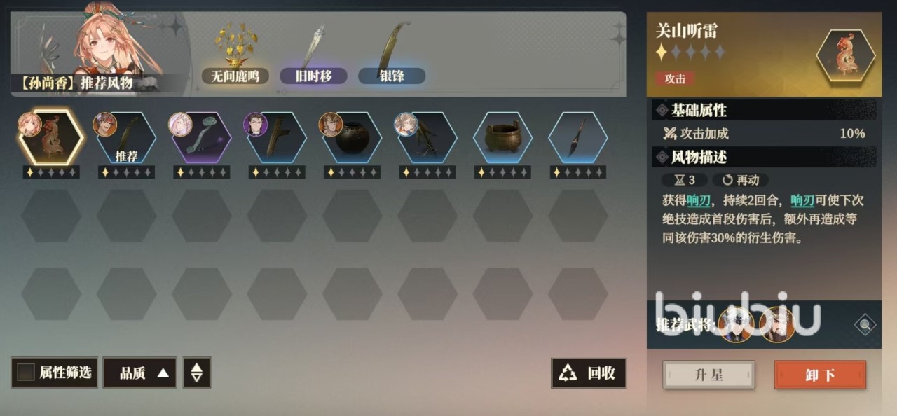 抽取到之后,接下来就是给合适的武将进行装备,一般来说是根据武将需要的核心属性,例如攻击类型的武将,就会选择增加攻击属性的风物。当然也要考虑到附加的效果。例如在一些需要驱散的战斗中,就可以选择带上具有驱散作用的风物,这样可以起到更强的战斗作用。如果不知道如何选择,按系统推荐的去搭配也可以。