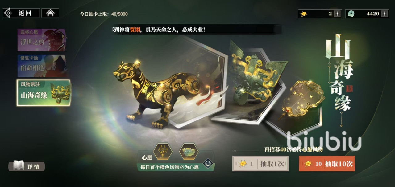 如果想要获得风物,那么主要是通过抽卡的途径。点击招募之后,就可以在卡池中看到有风物常驻卡池山海奇缘。和英雄卡池一样,在这里同样可以进行心愿的设定,每天出现的首个橙色风物,必定会是设置好的心愿中的一个。大家要根据自己的核心武将来设置心愿,这样可以达到快速养成核心的目的。抽取风物需要扶桑叶,这个道具主要通过充值中的组合礼包,扶桑叶礼包以及三山币兑换等途径来得到,还有部分活动可以赠送。