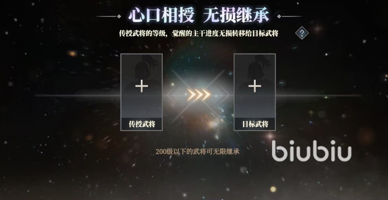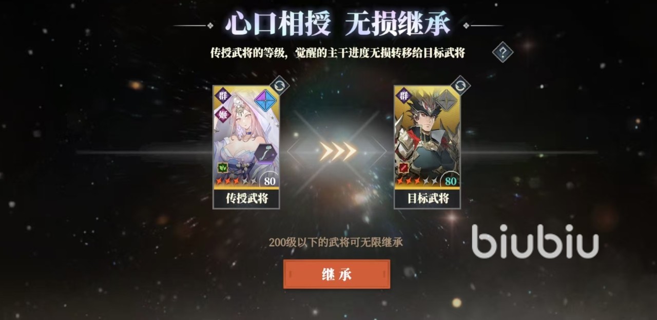 目标武将的等级、觉醒的主干区域,成长到继承前传授武将的进度,装备、风物,继承传授武将的配置。如果继承武将未穿戴同部位的装备或者是未穿戴风物,那么继承后不会将目标武将原本穿戴的同部位装备或风物卸下,好感度。星级以及资质不会改变,200级以下的武将能够无限继承。这里大家要区分清楚,继承和共鸣是有着很大的区别,共鸣仅仅是等级和觉醒能够一致,而继承可以将装备和风物都转移过来。