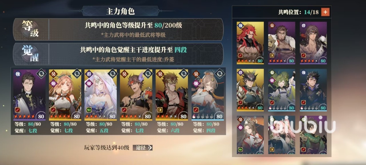 主力武将指的就是出场的6名武将,例如在这6名武将中,等级最低的为80级,其他都是90级,那么共鸣等级也是按照80级来进行计算。这6名武将中最低觉醒为4段,其他都是5段或以上,那么共鸣也是按照4段来进行计算。所以大家在培养主力的时候,一定要做到均衡,这样才可以让共鸣也享受到最大程度的提升。玩家可以在共鸣页面的右方,设置多名英雄享受到这一加成。