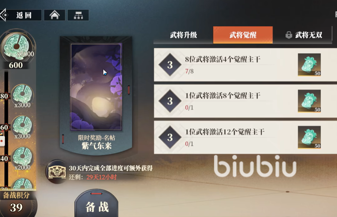 第二个就是武将的觉醒,这个觉醒的任务难度还是有的,最容易完成的任务便是一个武将觉醒8个主干,每次觉醒都能提升武将的数值,而觉醒8次基本上是到中后期了,而后续还要解锁12个主干以及8个武将的主干,其任务的完成时间很长,如果没有时间的玩家可能完成一到两个就可以了,如果比较肝的时候可以全部完成。