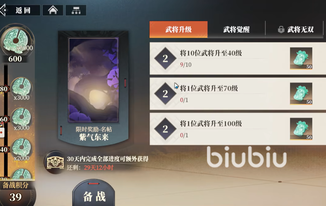 首先就是武将的升级,分别将武将的等级升到40级,70级以及100级,这个要求是比较低的,基本上抵达中期,玩家们所拥有的一个武将基本上都会达到满级,即便是慢慢玩的状态下也可以获得满级武将,没完成一个任务可以获得积分,而积分达到一定数值的时候能领取抽卡的道具,这样就能抽取强力的武将了。