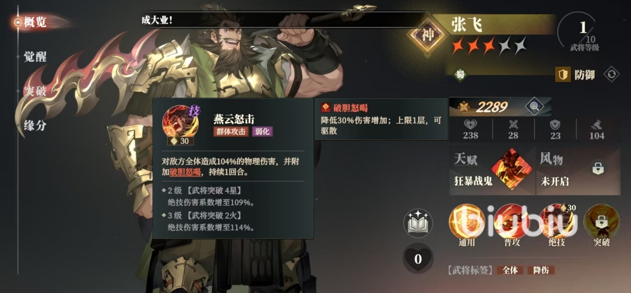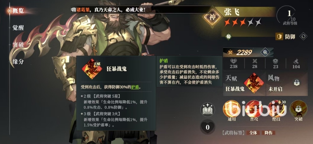 张飞的绝技是燕云怒击,它可以给敌方全体附加一次物理伤害,并添加上破胆怒喝。破胆怒喝只能叠加一层,降低30%伤害,所以对敌方全体的输出都是一次有效地降低,这也是张飞受到喜爱的原因之一。张飞的天赋狂暴战鬼,只要受到攻击就可以获得30%防御护盾,用来抵消伤害。在进行突破之后,还可以额外获得生命值降低后,攻击和防御提升,以及受盾率提升等属性。