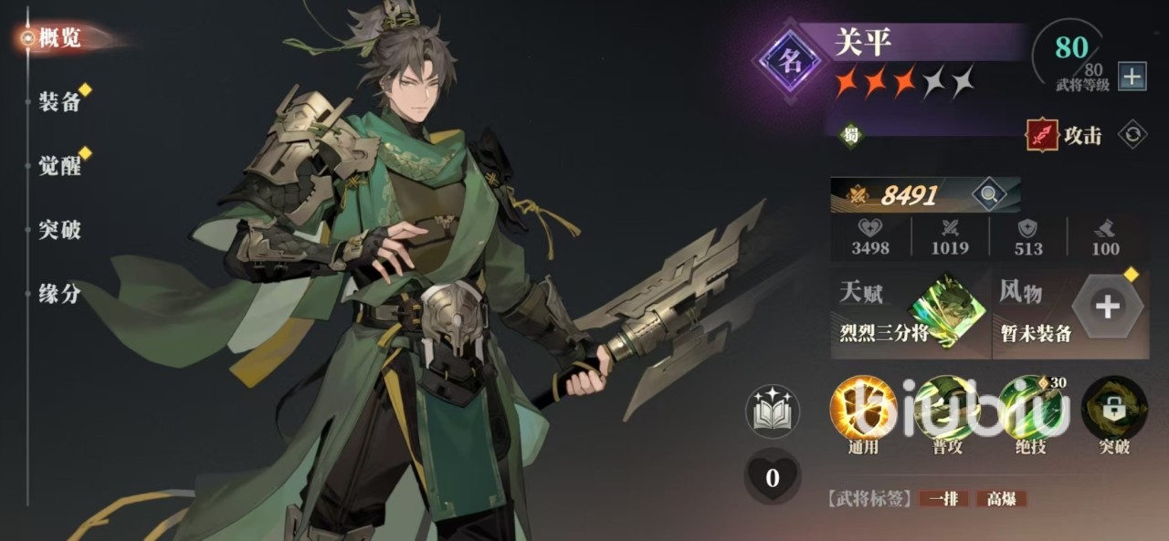 如果出场了张飞,刘备,赵云和关羽,那么另外两个可以选择其他阵营的辅助或是输出。如果使用其他阵营的奶妈代替刘备,那么就需要另外找一个蜀国武将,小编推荐关平,关平的绝技可以带来排伤害,这样阵容中所有的伤害类型都已经集齐,效果更加出色。关平还有永久暴击提升的特点,输出也不会低。