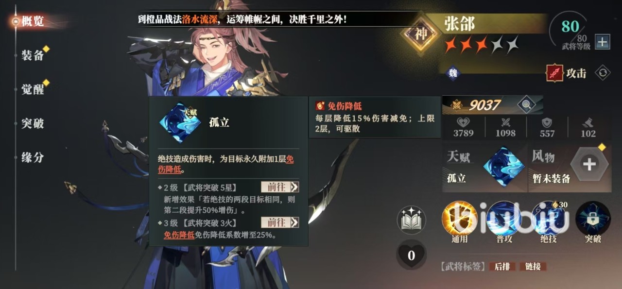 张郃是一个非常有特点的武将,他的绝技苍雷链可以对敌方任意一目标造成一次物理伤害,然后再对生命比例最低的另一个敌方造成物理伤害,并将它们链接在一起,持续两个回合。被链接的其中一方受到伤害时,另一方就会承受该次伤害40%的衍生伤害,场上最多存在一条链接。张郃的天赋还可以在使绝技造成伤害时,为目标附加永久免伤降低效果,每层可以降低对方15%的伤害减免,上限是两层,可驱散效果。