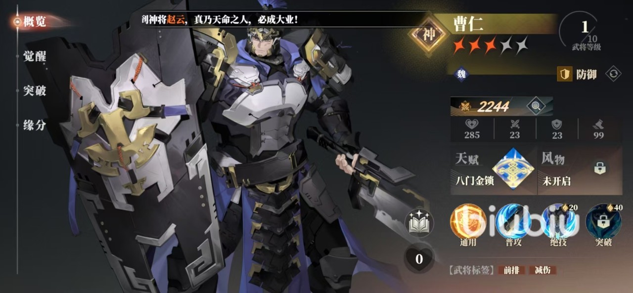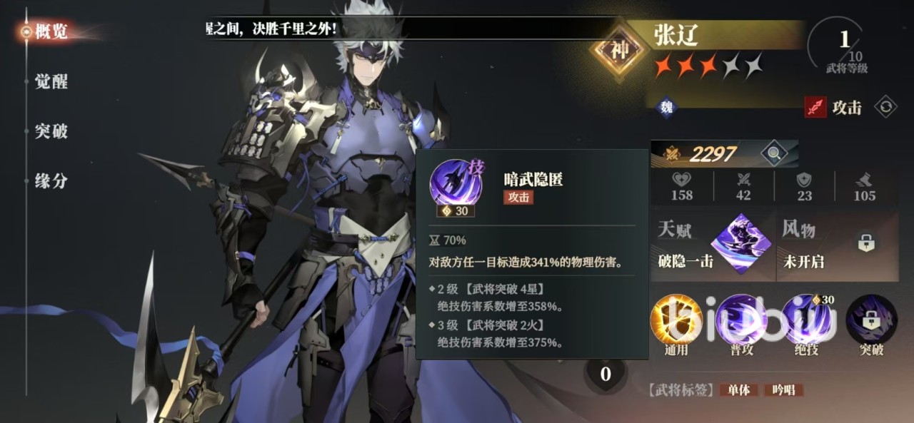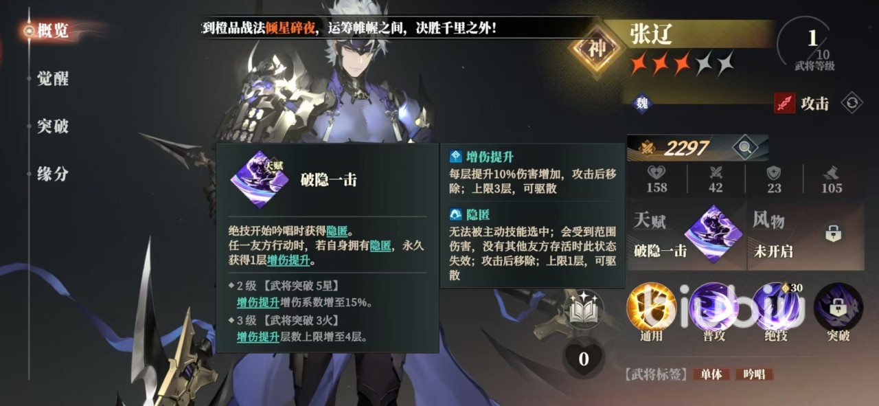 张辽是目前真正意义上的主c,他的绝技可以给敌方单体目标造成极高的物理伤害,突破之后绝技伤害系数进一步提升,堪称目前最狂暴的单指输出机器。自身的天赋在绝技开始吟唱的时候就能获得隐秘效果,在友方行动时,如果自身拥有隐匿,那么将获得增伤提升。这个效果每层可以增加10%伤害,攻击之后移除,最多能叠加三层。在隐匿的时候是无法被主动技能选中的,会受到范围伤害。所以使用好张辽的核心就在于尽量将层数叠加起来,然后直接打出破隐一击秒杀对手。