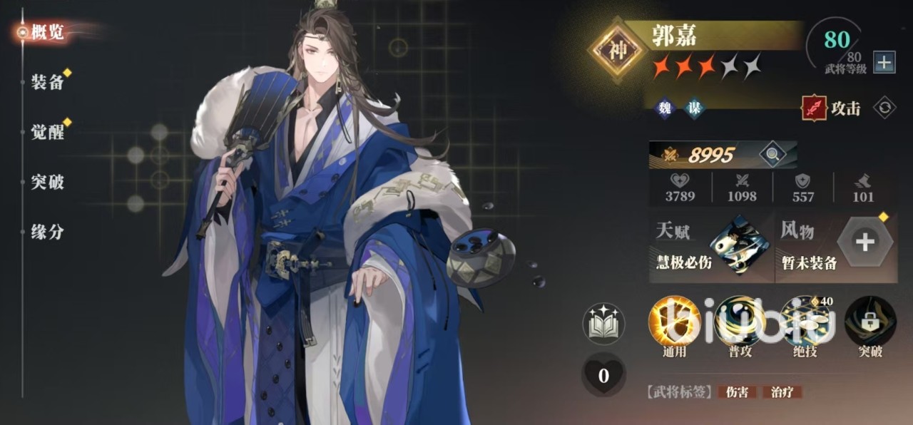 因为有了张辽,所以就不再推荐大家选择曹操,最后一个位置就直接给郭嘉,国家可以带来整列攻击和整列治疗特点,既可以对敌方一列造成法术伤害并驱散增益,又可以给对应的友方一列进行治疗,这样提升了整体强度。