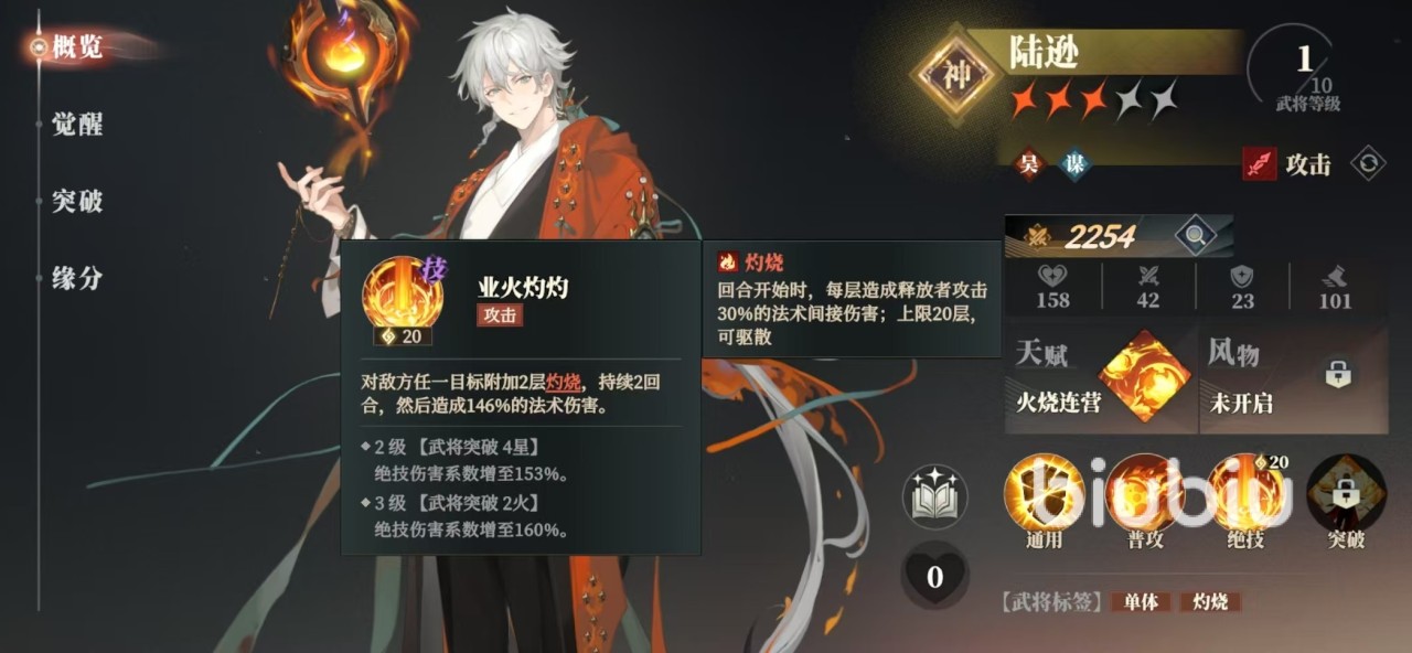 陆逊是属于游戏中的吴国阵营,它本身也是很强的谋士。自身的天赋火烧连营,在使用绝技造成伤害时,会将目标的灼烧层数复制给相邻的其他目标,复制的灼烧持续一回合。绝技是业火灼灼,对敌方任意目标附加两层灼烧,持续两回合,然后造成一次法术伤害。对方被灼烧之后,每回合开始都会受到释放者30%攻击力的法术间接伤害,最多能叠加到20层。所以陆逊最适合的就是组成火烧队,当然这少不了另一个核心武将周瑜的帮助。