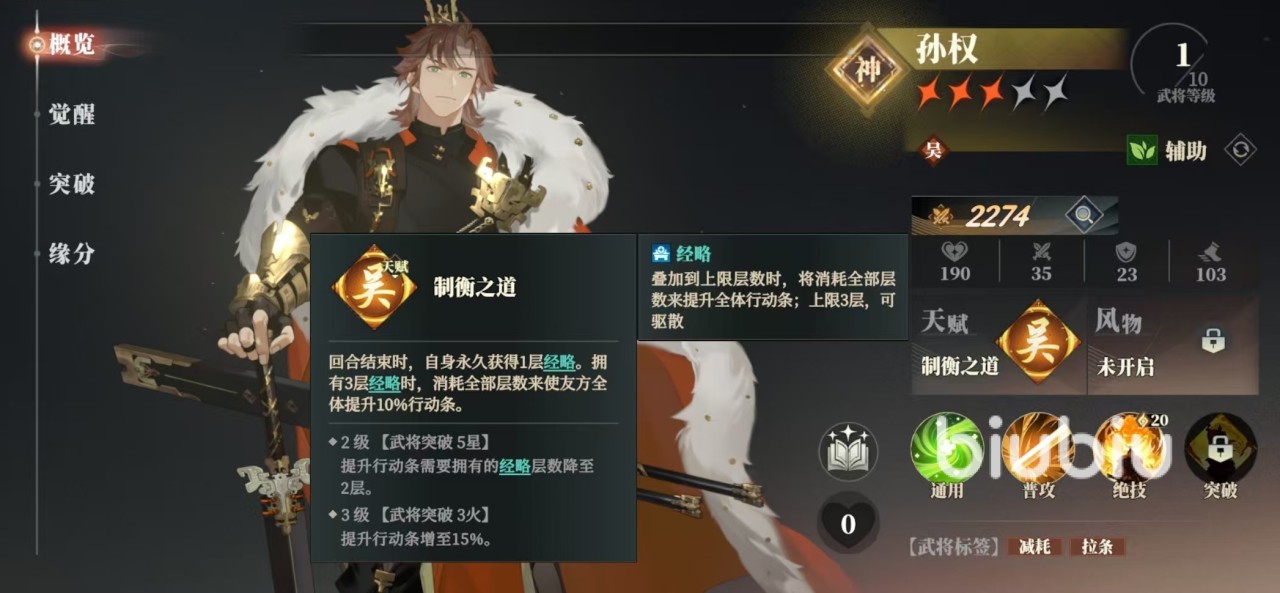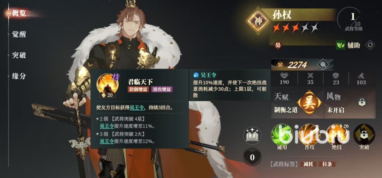孙权的绝技君临天下,使有方目标获得吴王令,持续三回合。在吴王令的影响下,能提升10%速度,并使下一次绝技战意消耗减少30点,只能叠加一层,可以被驱散。通过进行突破,吴王令速度能够增加到最多12%。自身天赋制衡之道,在回合结束时,孙权自身获得一层经略效果,当拥有三层经略时,消耗全部层数来使友方全体提升10%行动条。所以孙权是一个能够拉条和给友方带来速度增益以及战意消耗减少等增益效果的辅助。