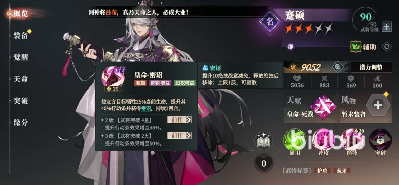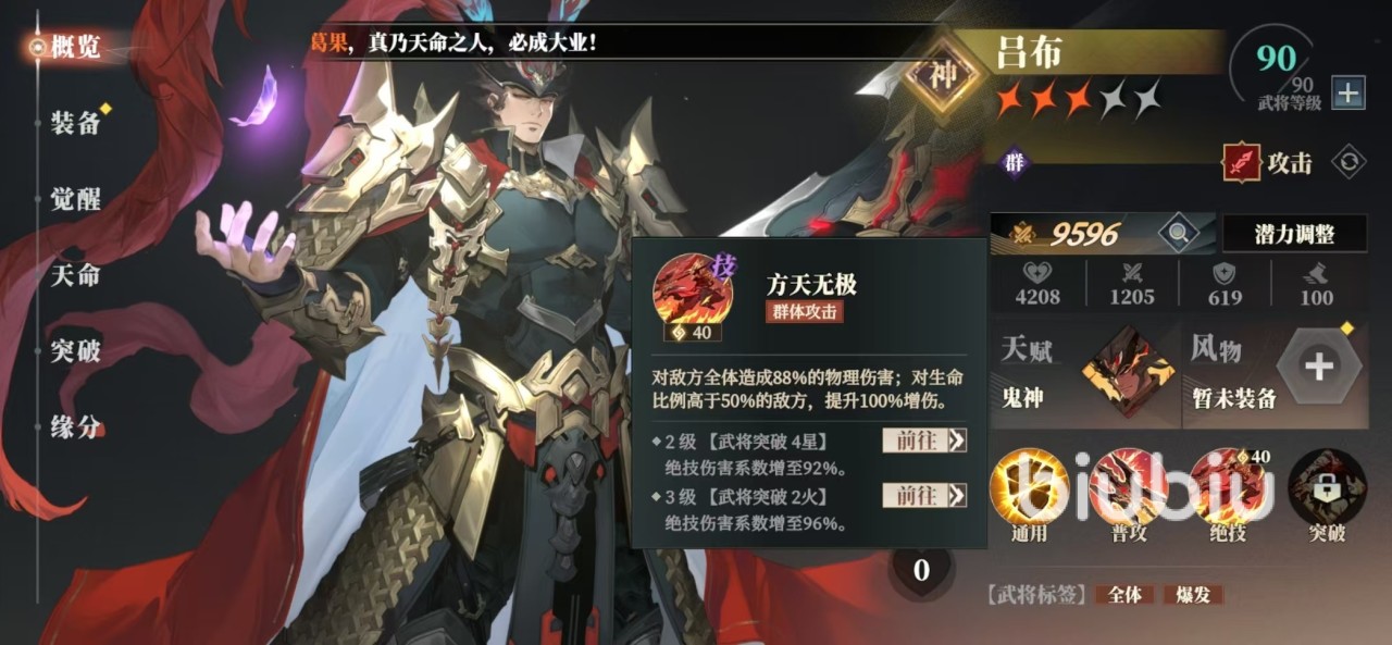 为了能够凑齐4名群雄武将激活阵营加成,第4个上阵的队友小编选择貂蝉,貂蝉也是吕布的好搭档,绝技能给全体施加护盾,还能通过自身天赋使得友方可以在攻击时消耗拥有的护盾来提升等量攻击,这对于吕布来说绝对是很有效的加成。最后两个位置可以任选阵营,推荐上单体输出强势的,例如曹操就是不错的选择。