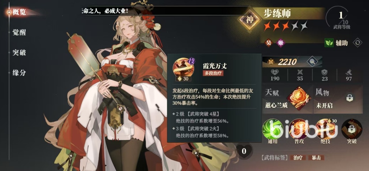 步练师作为游戏中的一名辅助,它的绝技可以发起6段治疗,每段都能对生命比例最低的友方进行加血,本次绝技还能提升30%暴击率。自身天赋在进行治疗时,如果目标生命比例低于50%,那么可获得治愈系数提升效果,如果生命比例高于50%,那么该目标能够提升行动条。后续通过进行突破提升,行动条能够增加至20%,至于系数能增加至40%。所以步练师是一个既能加血又能拉条的辅助非常好用。