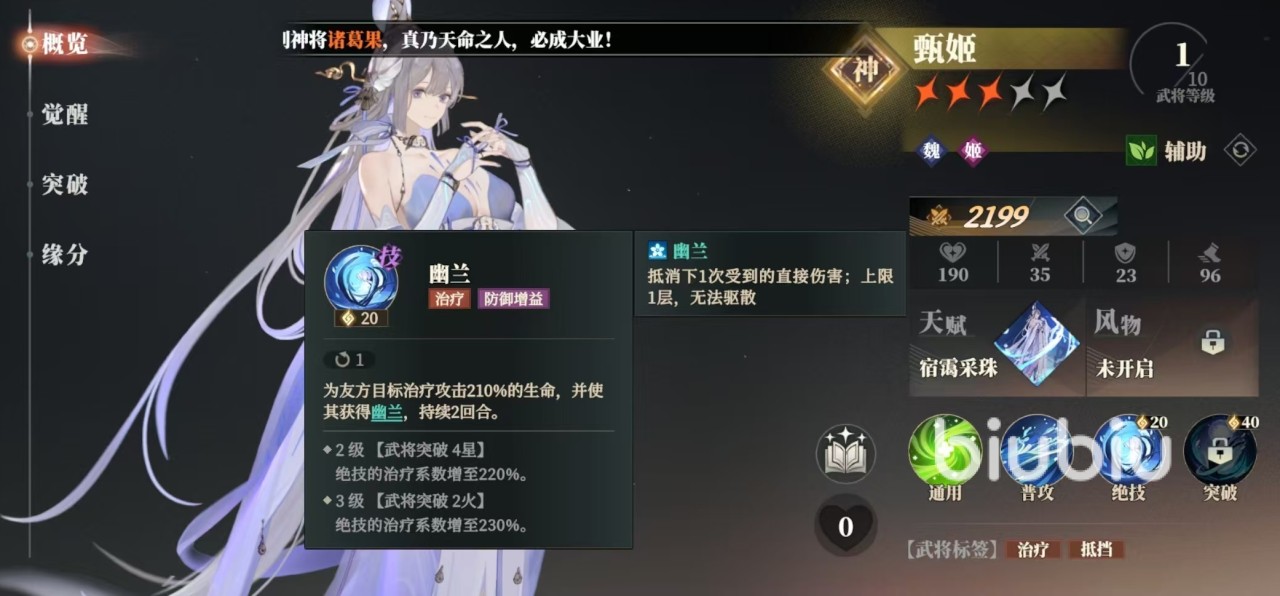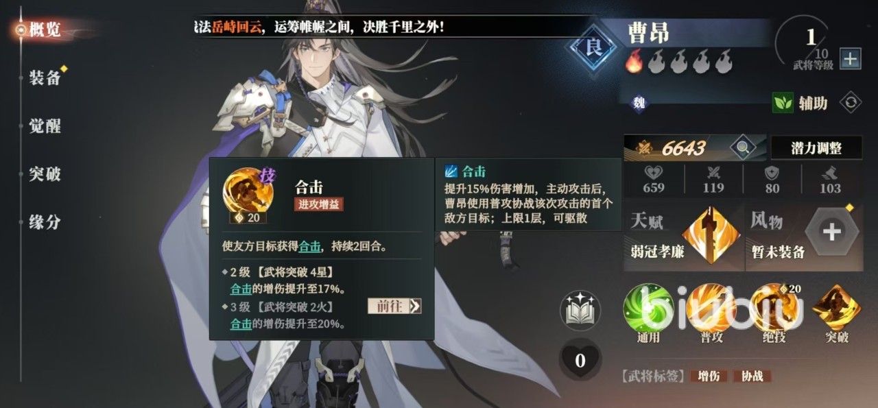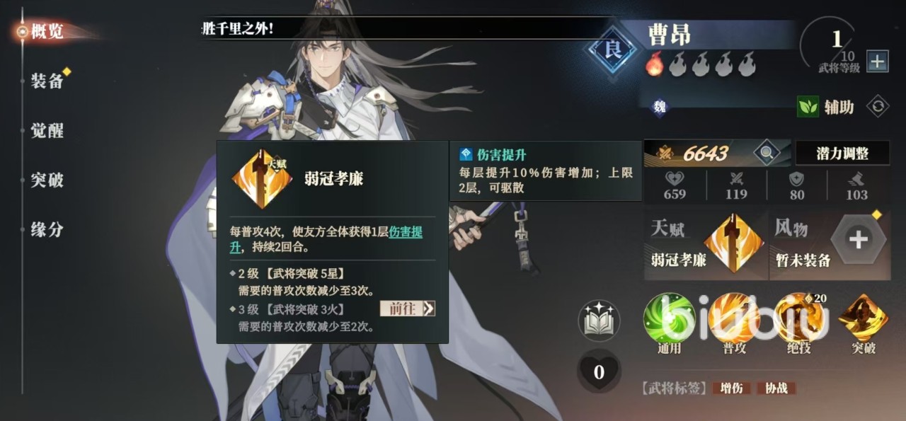 曹昂的绝技可以使友方目标获得合击状态,持续两个回合,合击状态最多能够提升20%的伤害增加,在主动攻击后,合击使用普攻协战该次攻击的首个目标。曹昂的天赋是每普攻4次,就可以使友方全体获得一层伤害提升状态,持续两个回合,通过后续突破,需要的普攻次数最少能减少到两次。带来的伤害提升,每层可以增加10%伤害增加,所以曹昂是一个辅助,但却是一个典型的进攻型辅助,可以让队伍整体输出实力变得更加出色。
