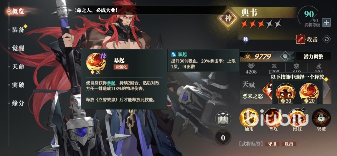 有一点要注意,曹昂在转职的时候一定要选择将军,这才是这一套阵容的根本。通过邀战,每回合可以让典韦多打出普攻,典韦释放大招时自身附加爆起,每次普攻都可以吸血并提高暴击率,这样就能将典韦输出比较狂暴的一面发挥出来。