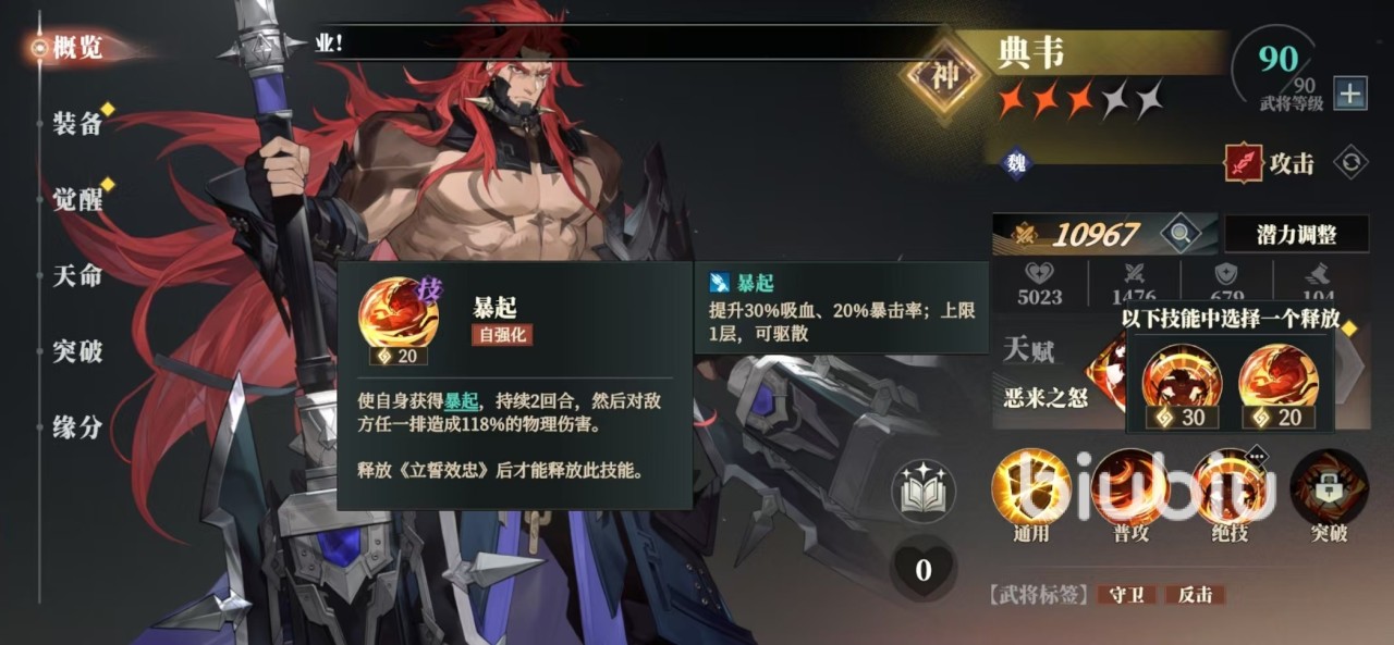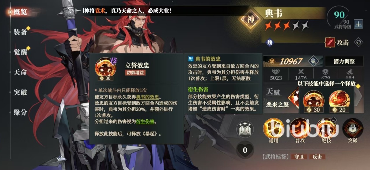 典韦比较有特点的地方,在于自身的绝技可以选择两个不同的技能释放,其中一个是立誓效忠,友方目标永久获得典韦的效忠,效忠的友方目标受到敌方回合内伤害时,典韦可以分摊并额外进行一次普攻。另外一个是爆起,典韦自身获得爆起状态,持续两个回合,然后对敌方任意一排造成物理伤害,需要在释放立誓效忠之后才可以释放此技能。暴起能够增加30%吸血,20%暴击,所以典韦的输出还是非常狂暴的。