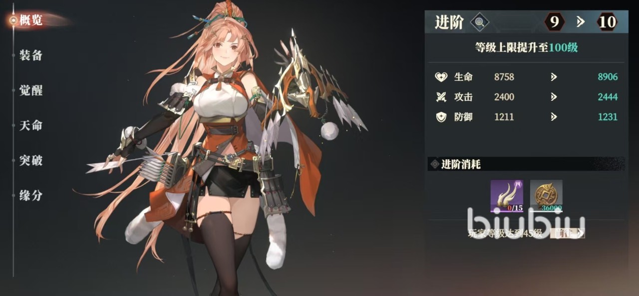 目前游戏中武将养成主要包括提升等级,穿戴装备、觉醒、天命、突破和缘分这几类,其中缘分是固定的,只需要大家上阵需求的有缘分的武将就可以激活。其他方面都需要自己动手进行提升,先来看一下等级,游戏中提升等级并不是无限制,和当前玩家的等级相关。例如如果想要将武将升到100级,那么需要玩家等级达到45级才可以,还需要结合着进阶,每升10级就要进行一次进阶,进阶之后才能继续升级。