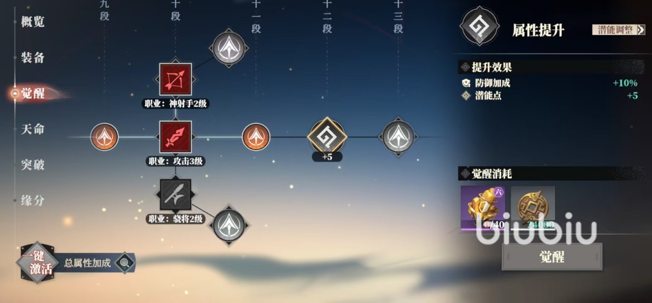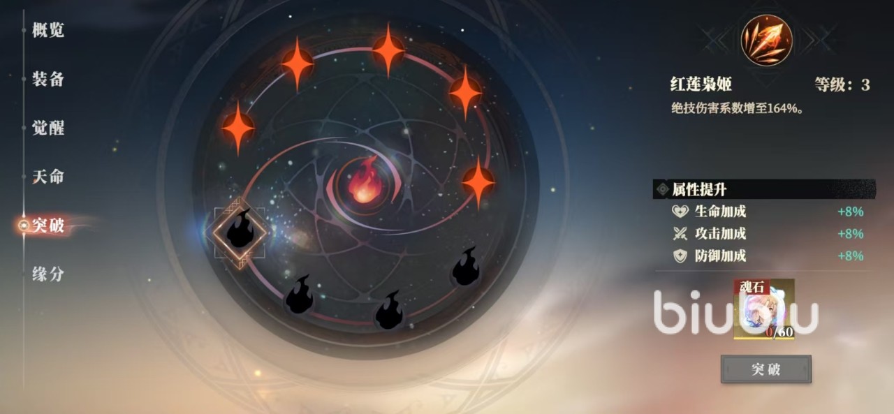 接下来是觉醒,觉醒是很重要的养成,这里需要的资源主要是通过灵犀商店购买到的玄龙珠以及在觉醒副本刷到的觉醒道具。因为有着体力的限制,所以大家要先去培养主c,再去培养其他角色。天命需要消耗的是命石,当玩家等级达到40级时才开启,能够在这里对武将进行重塑。最后是突破,突破主要消耗魂石,只要招募到同名武将就可以转化成魂石,是一个比较漫长的过程。