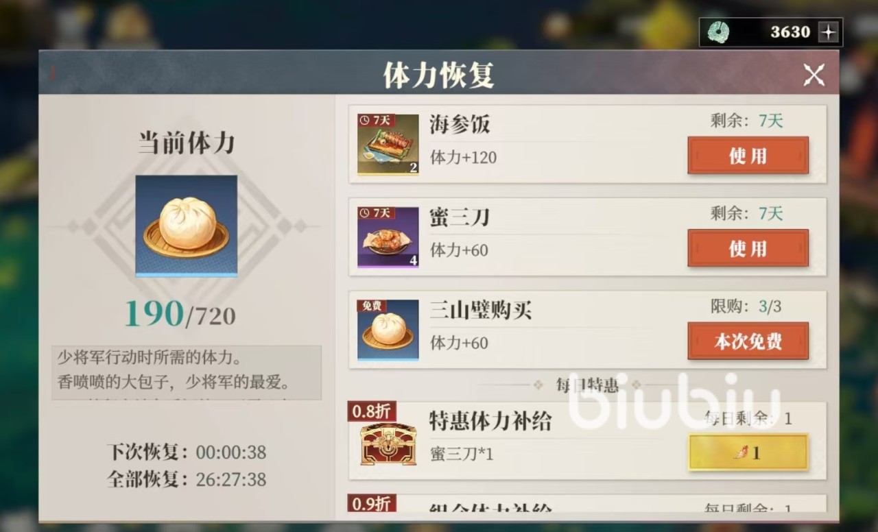 最后来说一下体力恢复的主要途径,首先是按照时间自动恢复,所以大家要及时看一下,争取将体力全部用完,这样不会浪费。还有每天有三次直接购买体力的机会,需要消耗三山壁,能够每次增加60点体力。最后就是通过使用道具的方式来恢复,包括海参饭和蜜三刀等,这两样都可以恢复体力。海参饭能一次恢复120点,蜜三刀一次恢复60点,这样就使大家有足够的体力去参加活动了。
