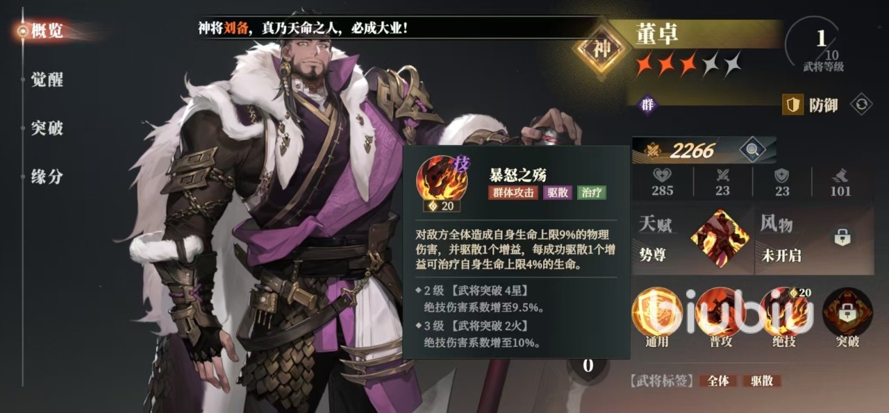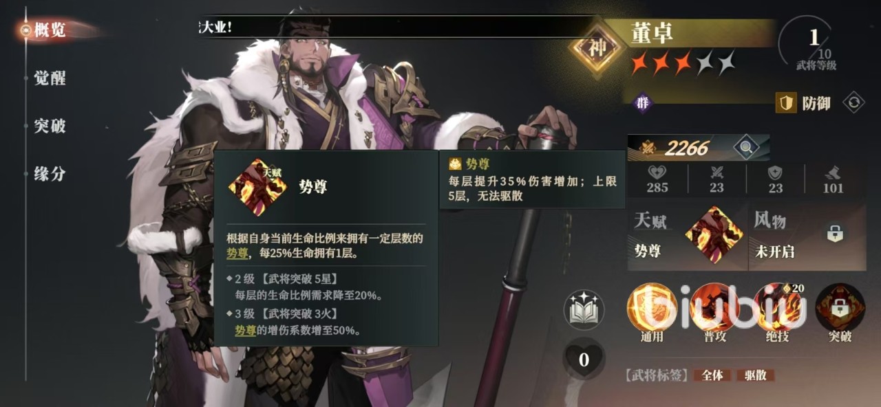 董卓的绝技能够对敌方全体造成一次物理伤害,是按照自身生命上限最多10%来进行计算,并驱散一个增益效果。每成功驱散一个增益,就能够对自身进行一次治疗,恢复4%上限的生命值,这个技能既有群体攻击又有驱散和治疗,非常全能。天赋是根据自身当前生命比例来获得势尊层数,每25%的生命就可以获得一层,每层提高35%伤害加成。突破之后,每层生命比例需求会降低至20%,增伤系数则提升至50%。