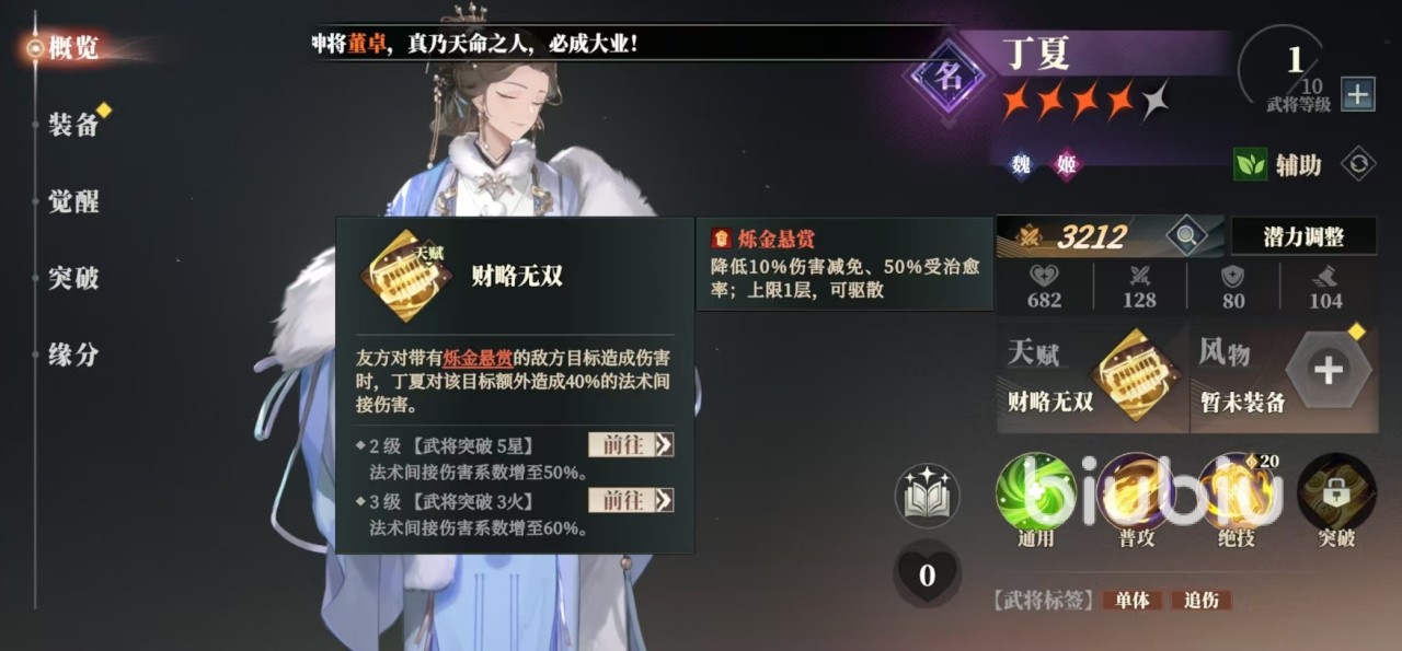 丁夏的定位是一个辅助,它是属于魏国和巾帼阵营,绝技是给敌方目标附加铄金悬赏,持续两回合。这个状态可以降低对方的伤害以及受治愈率属性,突破之后,降低的免伤系数最多能增加至15%。天赋是友方在对待有铄金悬赏的敌方目标造成伤害时,丁夏可以对该目标额外造成最多60%的法术间接伤害。突破之后,每造成第3次直接伤害或间接伤害,都能额外获得最多100%的增伤。