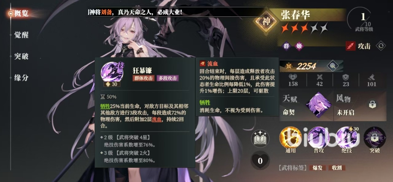 孙尚香是现在非常强势的输出型选手,张春华也是如此,只不过张春华技能特点是通过牺牲自身当前生命值,来对敌方目标和相邻单位进行多段伤害,然后附加流血效果。这两个武将一起加起来,输出方面绝对有保障,最后选择蹇硕的意义,在于辅助张春华打出更多的伤害。