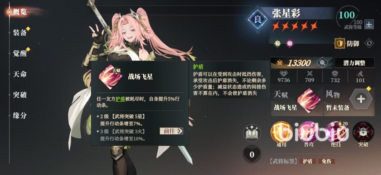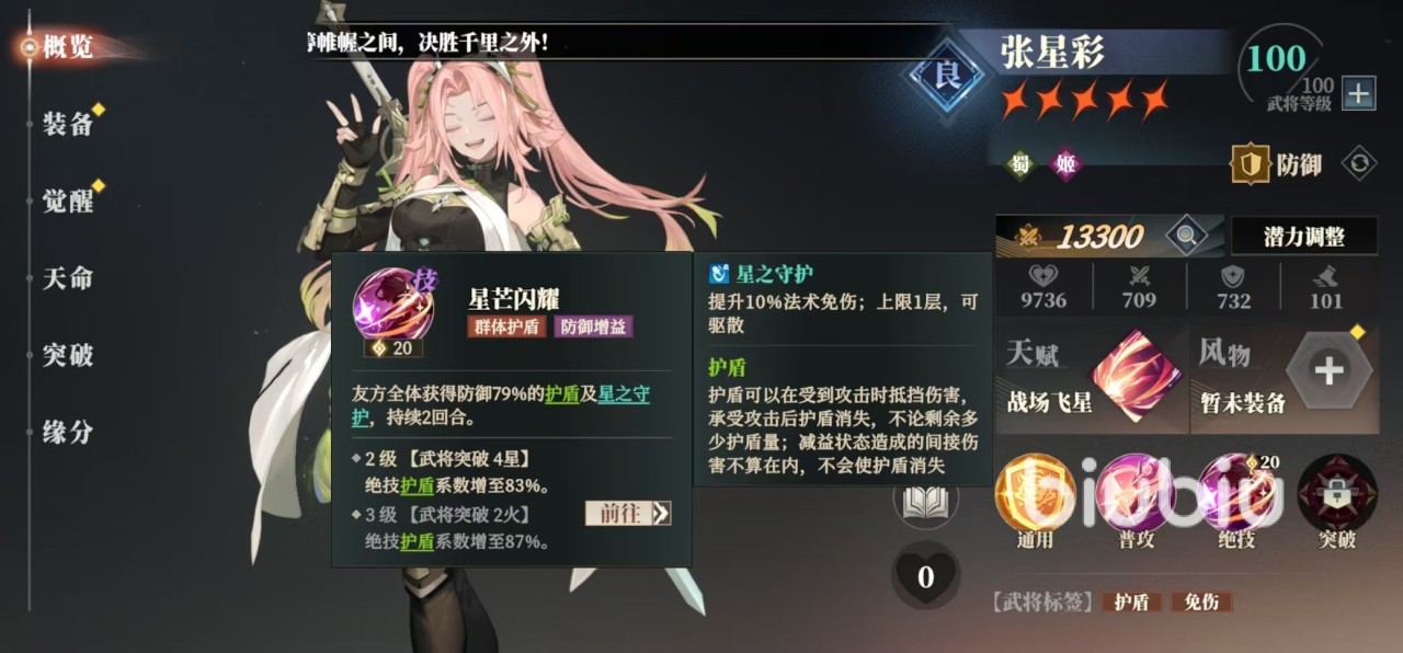 张星彩在游戏中定位是属于防御类型,它自身是吴国阵营,也是巾帼武将之一。天赋效果是当任意友方护盾被耗尽时,自身就能提升最多10%的行动条。绝技可以给友方全体都施加一层护盾及星之守护效果。星之守护能够带来10%的法术免伤提升,可以被驱散,不能叠加。所以张星彩在场上,对于整个队伍的生存能力,都是很大的加强,但自身在生存方面却并不非常突出。