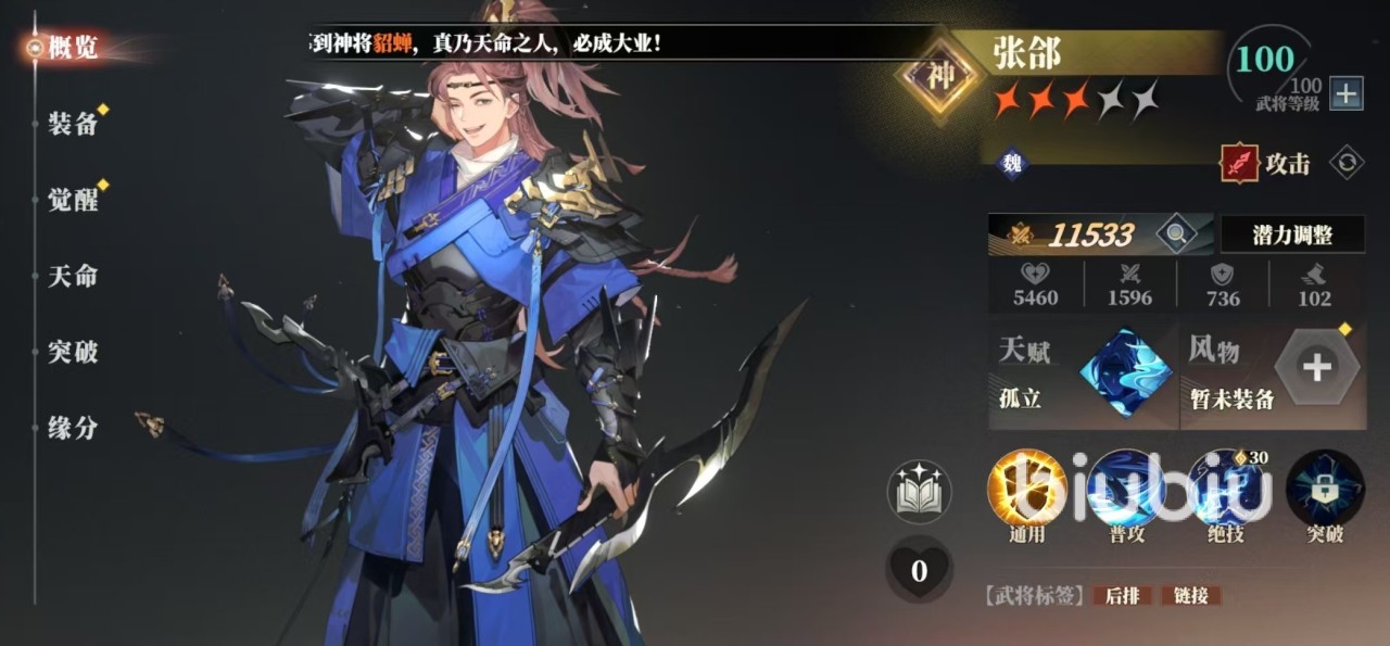 只要大家能够将乐进培养起来,达到突破五火的程度,为全体带来的增伤绝对是非常有效的,所以乐进完全值得大家作为副c去培养,在很多战斗中,群体输出也都能起到关键的作用。在阵容搭配方面,小编选择的是乐进、张郃、张辽、曹仁,这4人组成魏国阵容。曹仁当然是前排肉盾,至于张和和张辽这二人都是输出,但张辽明显是绝对的主c,张郃主要是利用自身的天赋,为目标降低免伤,以及利用绝技链接起来,让张辽伤害达到最大化。