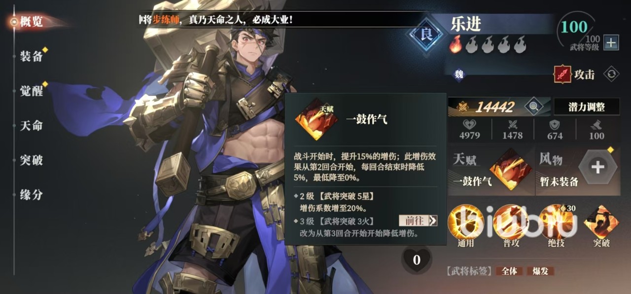 乐进的自身绝技勇冠全场,是一个很好用的群体攻击,他能对敌方全体造成最多135%伤害系数的物理伤害。天赋一鼓作气,战斗开始时获得15%增伤效果,从第二回合开始,每回合会降低5%。突破之后增伤系数最多能达到20%,改为从第三回合才降低增伤。突破之后的升星天赋,改为与自身和同排和同列队友也一起生效。这就相当于乐进的增伤效果,几乎能够覆盖整个阵容。