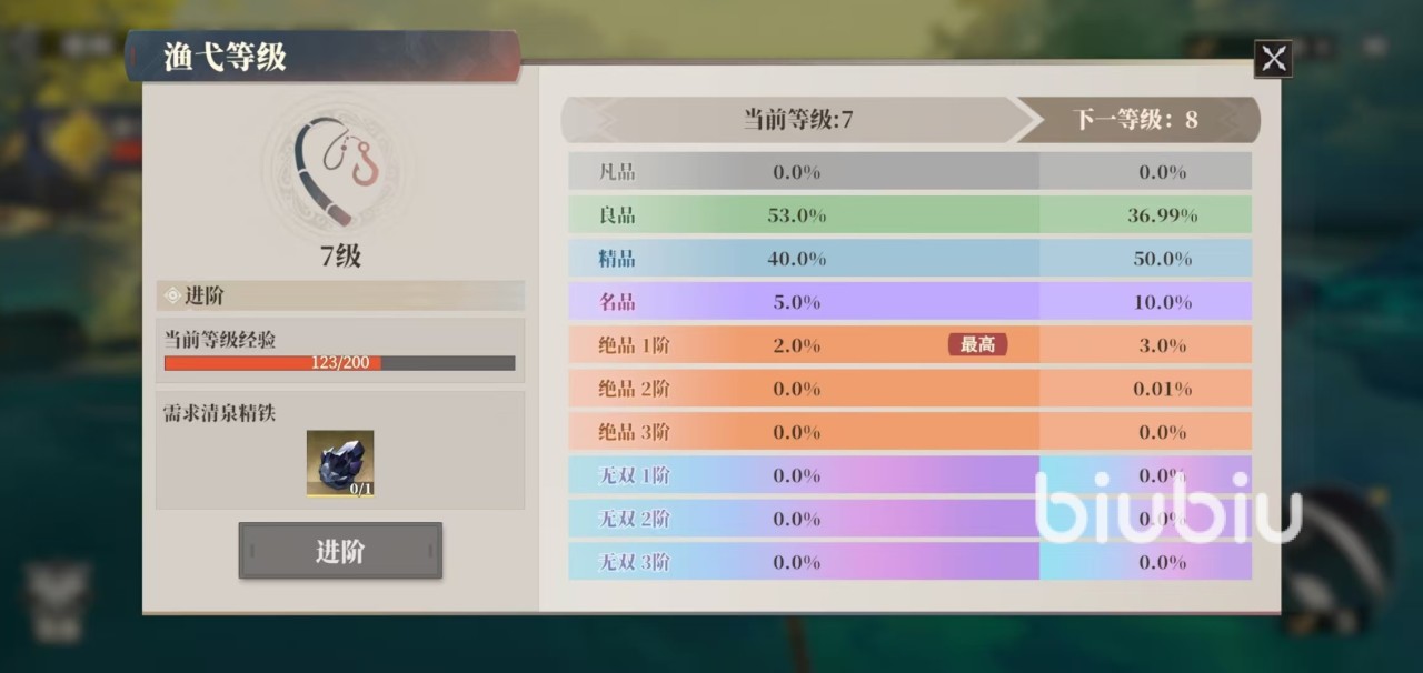 游戏中的所有装备都是通过这一项活动得到,每次钓上来的装备品级是随机的,但会受到渔弋等级的影响,最低的是凡品,最高可以达到无双三阶。等级越高,出现高品质装备的几率也就越高。要想提升渔弋等级,需要先达到一定的钓鱼次数,然后消耗清泉精铁就可以进阶了,清泉精铁是通过试炼兵械库所掉落的道具。