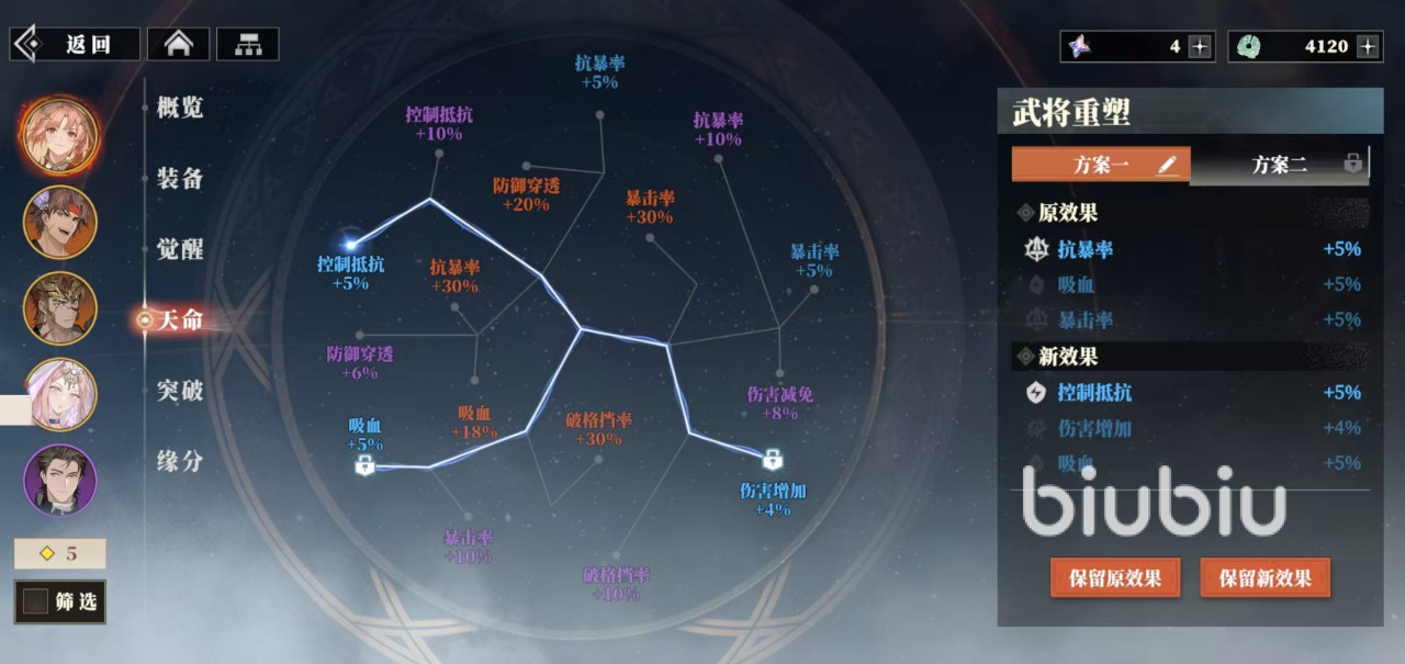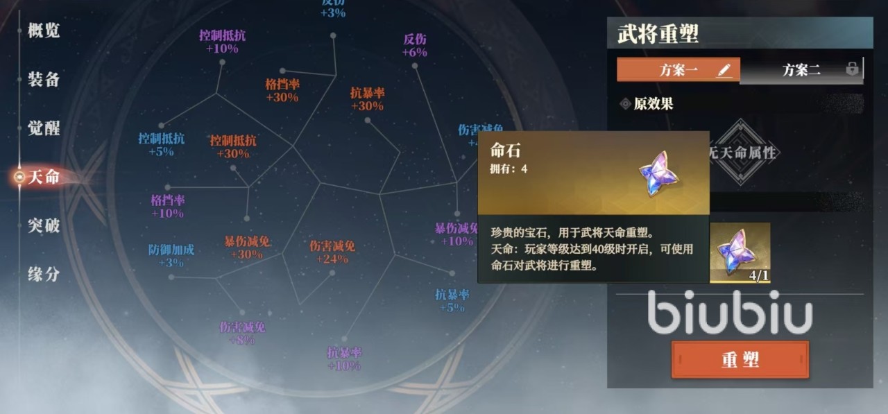 先来看一下如何设置方案,在这里进行武将重塑,需要消耗的是命石,在玩家等级达到40级开启天命之后,命石获取的功能也会同步开启。点击进行重塑,就可以获得不同的属性加成,大家根据随机生成的属性进行选择就可以了。如果感觉新生成的效果比较好,那么就可以保留,如果感觉原效果更出色,就可以保留原效果。