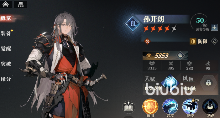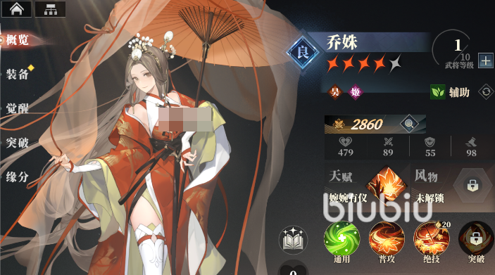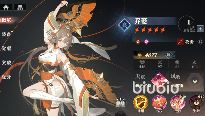 可以通过天赋来叠加自身的伤害,绝技则是单体多段伤害同时可以击退敌人的行动条,在使用突破技获得乱世之舞buff后,下一次绝技还能眩晕目标。点控在这种策略游戏里是很强的机制,因此乔菱也是可以培养的角色,而且作为蓝卡培养成本也不高。