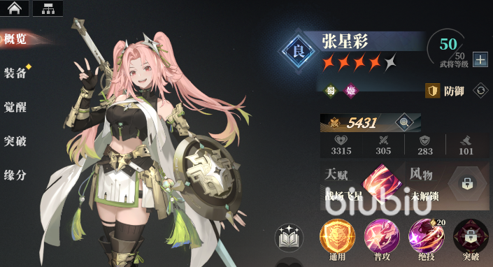强力的护盾型防御角色,普攻就可以给自己加护盾,绝技群体护盾并附加法伤减免,突破技则是入战就提供群体护盾,天赋则是护盾在被消耗掉的时候提升张星彩的行动条。优质的防御型角色搭配奶辅可以起到很好的保护作用。
