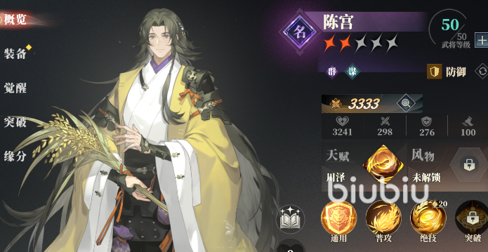 陈宫是很厉害的减益护盾坦,绝技可以给自己加护盾,并对敌方单体施加一个降低伤害的减益。突破技则可以给己方攻击最高的单位提升攻击力,直到其完成一次击杀。天赋则是队友在使用普攻或者技能攻击敌人时,如果敌人身上有多层减益那则可以治疗部分自身已损失的生命值。