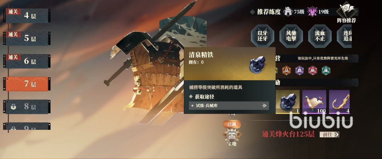 在渔弋中进行操作,所需要消耗的是九曜勾,这个道具主要通过兵械库、烽火台以及组合礼包购买的方式得到。在兵械库中,大家通关的烽火台层数越高,每天可以领取到的九曜勾也就越多,所以应该快速往前推进烽火台。另外每天还要及时过来收取,不然累计满之后就不会再增加了。提升渔弋等级所需要的清泉精铁,是通关每层的兵械库之后才能获得。