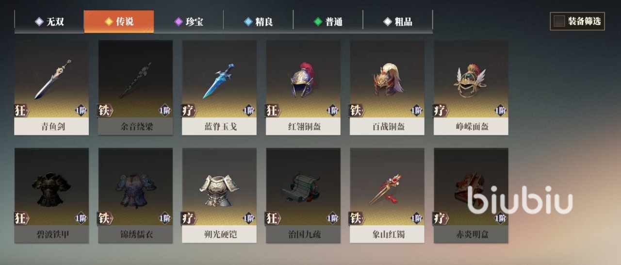 大家打开游戏中的图鉴功能之后,就可以直接看到有装备图鉴,这里面有各种分类,包括无双、传说、珍宝等,只有珍宝也就是紫色以上才会有套装。且紫色套装也只有一个退敌套装,两件套获得1.5%生命和攻击加成,4件套获得2.5%暴击率加成,属性非常低,只有达到了传说以上套装,才能真正发挥作用。传说套装主要包括狂战、疗养、铁甲这三类。狂战能够带来攻击和爆伤加成,铁甲可以带来生命值和暴击力的加成,疗伤套装能增加生命值、攻击力和治愈率,分别适合不同的武将去选择。